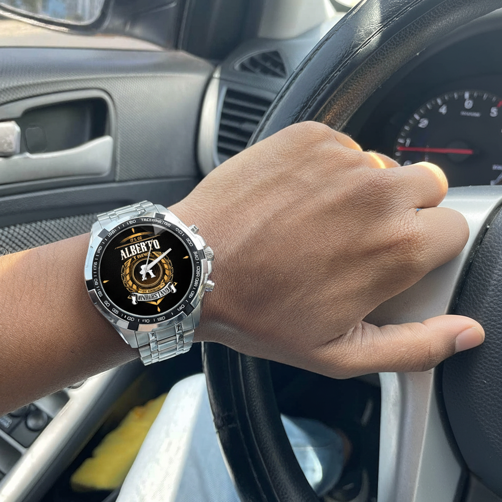 I’m really happy with my watch! The custom design with the 'ALBERTO' text makes it unique and eye-catching. The stainless steel band feels solid and comfortable, and the watch looks great in natural light. It’s a perfect accessory for everyday wear or as a special, personalized gift.